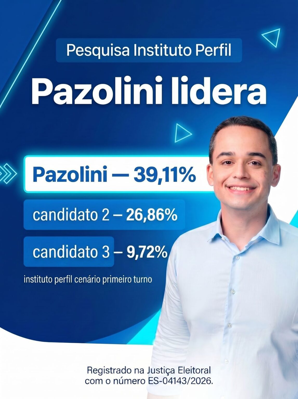 De acordo com os dados, Pazolini aparece com 39,11% das intenções de voto, mantendo-se à frente no cenário eleitoral. O segundo colocado registra 26,83%, evidenciando uma vantagem consistente neste momento da disputa.