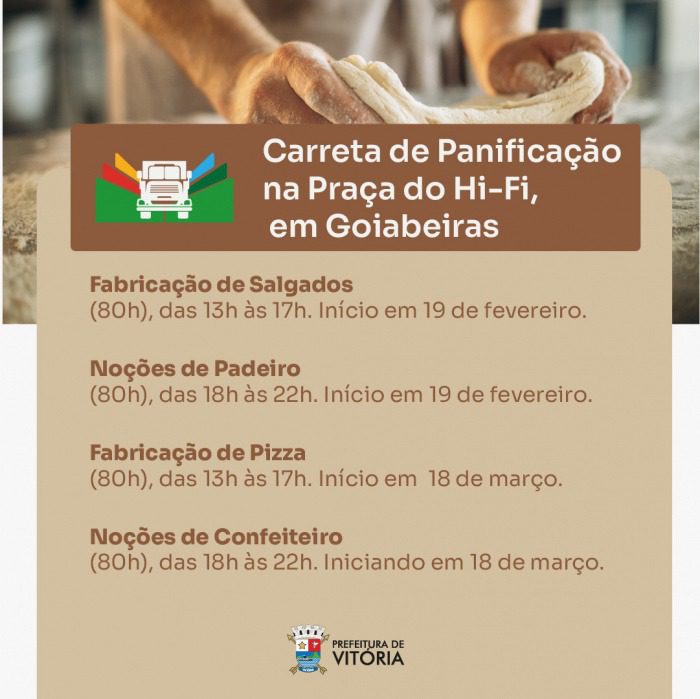 Últimas chances para quem quer começar, de forma imediata, um curso profissionalizante e gratuito de Panificação e Confeitaria. Ainda há vagas para os cursos “Noções de Padeiro” e “Fabricação de Salgados”, que acontecem na Pracinha do Hi-Fi, em Maria Ortiz.